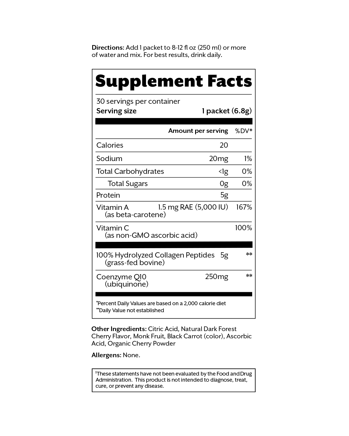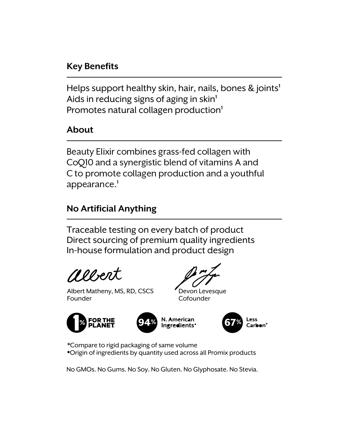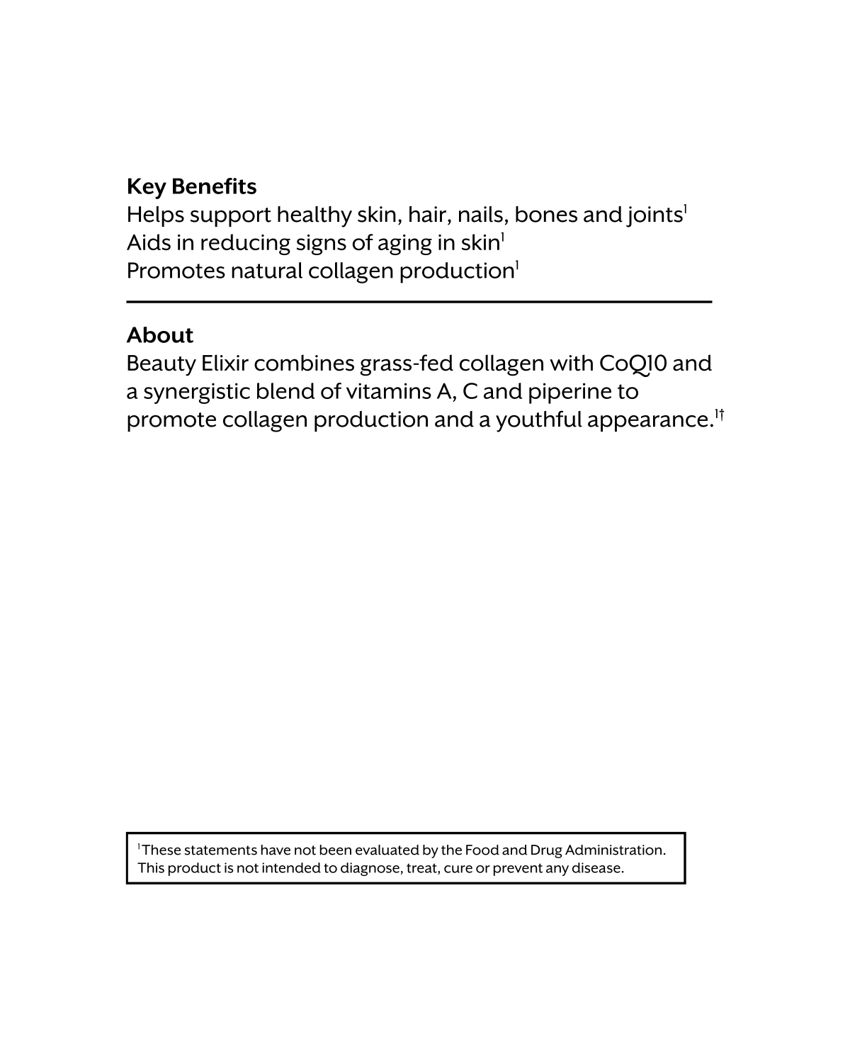 Beauty Elixir combines grass-fed collagen with CoQ10 and a synergistic blend of vitamins A, C and piperine to promote collagen production and a youthful appearance.¹