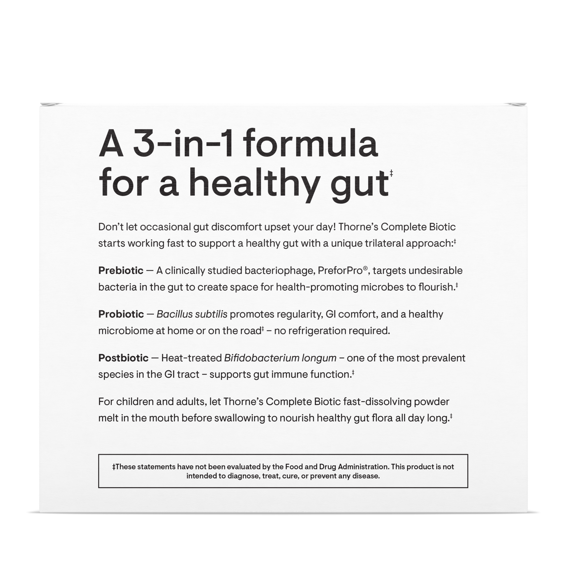 Thorne Complete Biotic is a clinically formulated 3-in-1 gut health solution combining a prebiotic, probiotic, and postbiotic in a convenient, fast-dissolving powder. Designed to support microbiome balance, digestive comfort, and immune resilience, each orange-flavored stick pack delivers targeted biotic strains and compounds to both the small and large intestines.